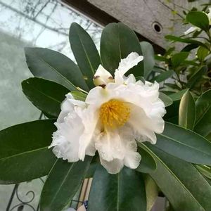散歩の途中、白い花。 ツバキに似てるけど、ちよっと違う。😊 調べたら台湾椿、大葉台湾椿かも。🎶