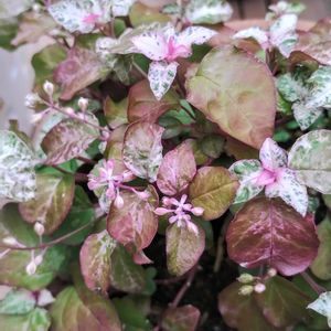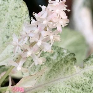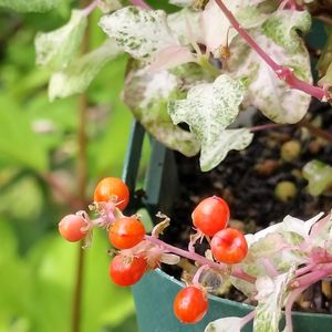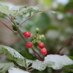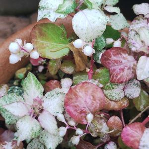 ジュズサンゴ絣💗 昨年9月に買った斑入りのジュズサンゴ✨ 軒下でなんとか冬越しできました♪ ほぼ無くなってた葉っぱも復活、小さなお花も咲いてます😆 赤い実のもあるようですが、このコは白い実を付けます✨赤いのも欲しいなー