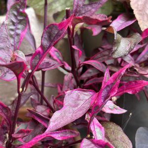 こんにちは 蒸し暑い1日です💦 冬越しチームのカラーリーフたち アルテルナンテラ コタキナバル(斑入り赤葉千日紅)¥50🤣 パープルファウンテングラスの株元にジュズサンゴ絣 クロロフィッツムスターライト ヨウシュコバンノキ ピンクの葉っぱが可愛い みんな元気になってきた 🏷️レスキュー