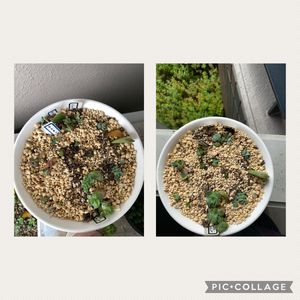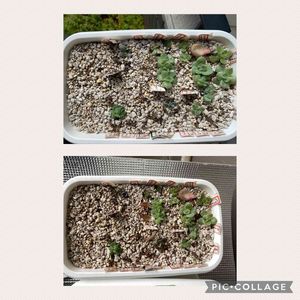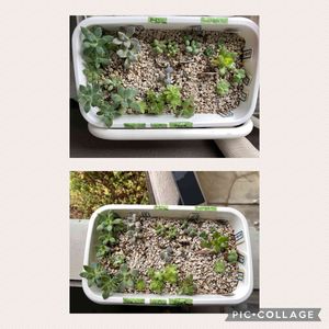 先日の祝日に寄植えを半分だけ手直ししました🪴 右側は多少セダムが伸びたぐらいで 運良く焦げませんでした。 残したままだと仕立て直しにくいかな?と 思いましたが 伸びたセダムを押し込んだぐらいで そのまま利用しました。 左側は寄植え達を解体した時の 痛みが少ない子を再利用したり お一人様の徒長した子をカット✂️して 追加しました🌱 ➡️ そのまま利用した右半分 ⬅️ 徒長したハヤロビさんをカット✂️して追加したり 再利用して植えた左半分 今日も良い天気だったので 不織布2枚重ねで遮光してました が… 先程外して多肉さん達を見たら 焦げが酷くなっていたり 新たに焦げた子がいるのを発見💧 不織布だと薄いのかなぁ💧 それとも今までダメージを受けていたけど 表面化せずにいただけだったのか💧 痛々しい子がまた増えてしまいました😭 追記 徒長したリラさんもカット✂️して 使ってました🌱
