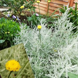 冬、寄せ植えで楽しんだサントリナ♡ 地植えにしたら大きくなり花が咲きました(⁎˃ᴗ˂⁎)♡