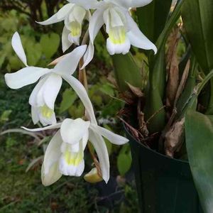 ずっと外置きだったセロジネ インターメディアも、鉢によりますが、5分咲き~満開になりました。 セロジネ インターメディア Coelogyne Intermedia ラン科セロジネ属 セロジネ インターメディアはヒマラヤの麓に自生するセロジネ クリスタータ(Coelogyne cristata)とタイ、マレーシア、インドネシアの山岳地帯に自生するセロジネ トメントーサ(Coelogyne tomentosa)を掛け合わせて作られた交配種です。 冷涼な環境を好む両親に似ず、特別な管理をしなくても普通に夏を越しますし、冬も凍結したり雪が積もったりしなければ特に問題なく越せます。 植え込み材も選ばず、水苔だろうがバークだろうが、ヤシ殻だろうが軽石だろうが、木炭や燻炭を使っても、しっかり水さえやれば元気に育ちます。 花芽も、低温処理や乾燥処理など特別なことをしなくても、10~11月には勝手に出てきます。 バックバルブからの発芽・再生も早いので、余程の事がなければ、完全に枯らしてしまう失敗も少ないと思います。 蘭は育ててみたいけど難しそう、と思っている人が最初に育てるのに最適な蘭の一つじゃないでしょうか。