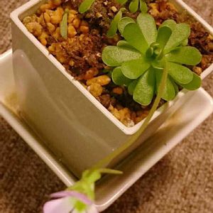 食虫植物 御専門の皆さま〜💦 スミレちゃんの落ちた葉っぱから 芽出て来ました😍 多肉と一緒なんですね❗ で、このあと、この芽は避難させますか? このままでいいんですか? 土とか変えますか? 教えてください(*`ω´人).。oO