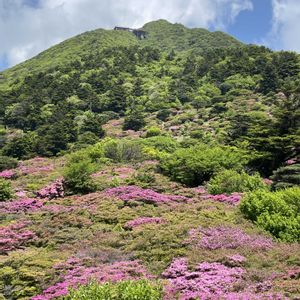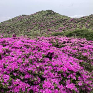 九州の火山性高山にだけ咲くミヤマキリシマ。花の直径は約3cm。色はピンクの濃淡かオレンジ。山麓から咲き始め今は標高1000m辺りが満開。 4年前同時期に百名山とミヤマキリシマ✿を求め歩いた九州の山道。事前にに玖珠町観光協会でミヤマキリシマの開花状況とハイキングコース🥾、🅿情報を入手。 午前は曇りの予報だったので撮影📷と🅿のこと考え、あえて歩くのは午後からに遅らせ吉部台登山口🅿で🍱を済ませ出発。これが大正解。 午前中は平日にもかかわらず満開のミヤマキリシマ求める🚙で🅿は満杯で道路脇に停める🚙が数十台だったが、うまく帰宅する🚙と入れ違いになりすんなり🅿に置けた👍️ ちょうど歩き始めた頃から太陽☀が出始め万年山の頂上に着く頃には晴れに。頂上までの途中にあるミヤマキリシマの群生地は規模が小さいが九州の山並みが見渡せ絵になるが、ミヤマキリシマは花が小さく遠景で撮っても映えない😭 もう一つのはなぐり登山口から約30分で行ける『はなばたけ』の方がミヤマキリシマの群生地としてはかなり広いが周りの山の展望は全く効かない。吉部台登山口を起点にハイキングコース🥾約10kmあまりをグルっと4時間かけ歩いた。 ⭐移動ルート 吉部台登山口🅿🚻🥾ミヤマキリシマ群生地🥾避難小屋🚻🥾万年山山頂🥾はばたけ登山口🅿🥾はなばたけ🥾吉部台登山口 🥾11km 👣16500歩 ✿ミヤマキリシマ、アザミ、ガクウツギ、 🐦️ウグイス、ツツドリ、アオゲラ、ホトトギス、ヤマガラ、サンコウチョウ、コマドリ 夏鳥のサンコウチョウの初鳴き体験。 通常1500mくらいの標高がないといない コマドリがいたのにはビックリ👀