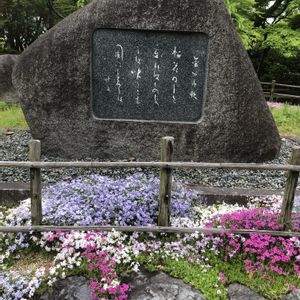 長岡天満宮にて、シバザクラに囲まれた「菅公御歌の歌碑」をパチリ!📸🪨🩷💜🤍🌿😊😄 長岡天満宮は、菅原道真が太宰府に流されるとき名残を惜しんだ地だそうです。⛩️🤔😢👌