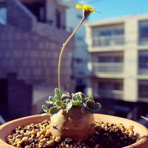 オトンナ・カカリオイデス 太陽に向かって伸びる小さい花たち。高原に咲き乱れる花畑のようだ✨ 薄く平たく大きくなってると思ってたけど、少し掘ってみたら地中も大きくなってるっぽい!! 来年塊根出そうか迷うな~😆