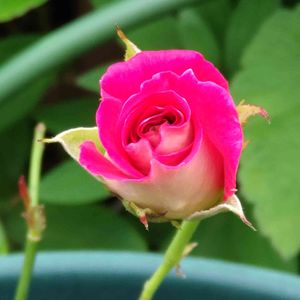 あまりの暑さの中で、咲こうと頑張ってるバラ 夕方、水をかけたら生き返ったみたい。😊