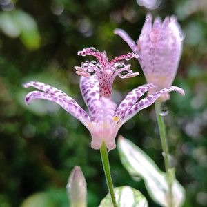 こんにちは☔ 今朝の朝顔さん雨に濡れながら ピンクがきれいに咲きました 杜鵑草は今日2輪咲いて 計3輪になりました ミックスと言いながら 同じ種類のように思えます 最後は花壇でかなり虫に食われた 竜胆咲き杜鵑草ですが 咲くにはもう少しかかりそうです