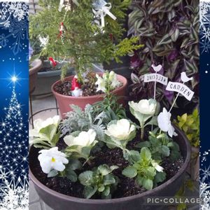 ホワイトクリスマスのイメージで寄せ植えを作りました🎵 キンギョソウ、シルバーレース、葉牡丹、パンジーみんな白❤️