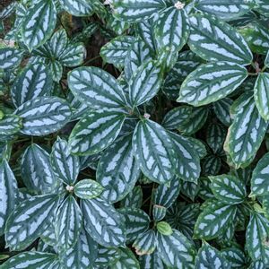 🏷️2のつく日は斑入りの日 ☆ アサバソウ ① 葉の模様に惹かれます ② 花も咲いてます ③ 奥のカカオの実が色を添えます 新宿御苑にて 11月7日