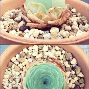1枚前のpicとは全然様子の違う休眠中のセンペルビウム このコは春にお迎えしたセンペルさんで、赤い葉が美しい姿でした❤️ センペルビウムは夏休眠するので、水を切るときゅっと丸まります 水切りしてるので、ランナーがシワシワに枯れちゃったけど、切り離した向こうにある子株もちゃんと根付いて母さんと一緒におやすみ💤してます (おやすみ突入のころが6/13にあります) 1つ前のセンペルさんは地植えなので土からの水分であんなにイキイキしてるんです 同じセンペルでも地植えや鉢植え、水の与え方でこんなに姿が変わります 多肉は奥深い生き物です💚😊
