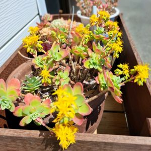 ①多肉畑の薄化粧さんの黄色いお花 可愛いー💛🌼🥰 ②名前分からなくなったセンペルさんモリモリになってる🤩 ③今日 HCコーナンさんの多肉寄せ植えバイキングでの寄せ植え🎶💕
