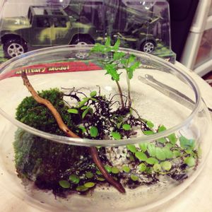 いつも植物達を置いている窓辺に新しい仲間が加わりました♬ハンドメイドのサイトで一目惚れ、買ってしまいました٩꒰*´◒`*꒱۶ෆ͙⃛中の水草は最初から付けてくださいました、種類は不明です^o^