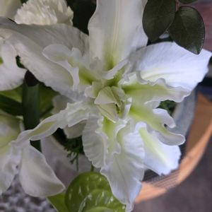 八重咲きオリエンタルユリ ローズリリーアイシャ 🏷白い水曜日♡ 花粉が出ない、白い花びらに薄いライムグリーンのラインが入った八重咲のユリ。 雌花は見えますが、雄花らしき?ものには花粉がついてません。 今年は、花数が多く、2輪咲き終わり、3輪目の開花です。 白い花で清楚なんですが、花びらの先の方が茶色くなり、傷んだ感じになります。昨日雨が降る前に撮っておいて、良かったわ🥰