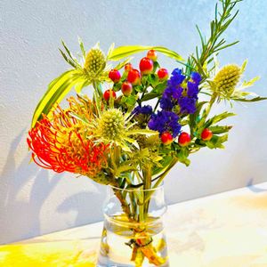 お出かけの帰りによく寄る隣町の小さいスーパー。 最近経営者が代わりお祝いの花がバケツに入れてありました。くたびれていたけど珍しい花があり貰って帰りました。 プロテア (南アフリカ原産 花の王様) 観葉植物のドラセナやコルジリネアイチアカは挿し芽に出来るので嬉しいです🥰 今日は整体に行ってきます👋😃
