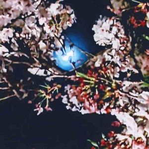 ちょっとボケちゃいましたが、夜桜見物してきました👍 桜の花の間から三日月🌙が覗いていました