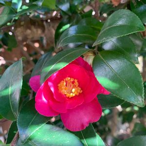 🌳木の花たち その110 ツバキ(椿) 赤の一重咲きの 椿が咲いていました。 まだまだ先だとばかり思っていたので、 思いがけない出会いにテンションアップ (*゚▽゚*)🎶 椿は花もさることながら、 葉も光沢があり美しい。 葉からついた名前が幾つもみつかりました。 📍 「ころもがへ椿は花の紬かな 」 舎羅 📍 「十月や早珍らしき赤椿 」 成田蒼虬 🍬 🏷木曜は木の花 🌤 *・゜゚・*:.。..。.:*・'🍁✨・*:.。. .。.:*・゜゚・* 🔸科名・属名 ツバキ科 ツバキ属(カメリア属) 🔸学名 Camellia japonica 🔸英名 Camellia 🔸別名 ヤブツバキ ヤマツバキ 🔸由来 厚みのある葉の意味で「あつば木」 つややかな葉の意味で「艶葉木(つやばき)」 光沢のある葉の意味で「光沢木(つやき)」 🔸原産地と分布 日本(本州、四国、九州、沖縄) 台湾 朝鮮半島南部 中国(山東、浙江) 🔸花期 11月~12月 2月~4月 🔸花色 赤 ピンク 白 複色 🔸結実 7月〜8月 9月〜11月(収穫期) 🔸特徴 日本原産。常緑高木で、光沢のある濃い緑の葉を もつ。名前の由来には諸説があるが、どれも、 花より葉の美しさが名前の由来とされている。 和名としてのツバキは野生種のCamellia japonicaのことだが、一般的に本種を交配親に もつ園芸品種も単にツバキとして扱われることも ある。さらにツバキ属全体を指してツバキと 呼ばれることもあるため、流通の現場では間違い を避けるため、ヤブツバキと呼ぶことがある。 🔸品種 園芸品種の系統 ①ヤブツバキ系 ②ユキツバキ系 ③ 侘助(わびすけ)系 …ヤブツバキと他の種との雑種 などがポピュラー。 🔸用途 ①主に漆器、彫刻などの材料 ②道具の柄などの小物の材料 ③ツバキ油 ④朱肉の製造 ⑤高級な炭の材料 など。