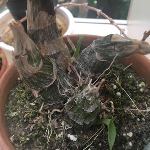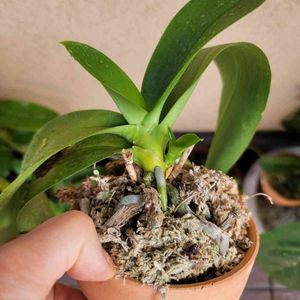 今年花芽がシケてしまったクロウェシア レベッカノーザン ミツカビの手前のバルブの根本から新芽🌱が2本と隣のバルブの2節目から高芽🌱らしきものが出てきました🙀 🌱🌱🌸🌼