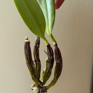 Dendrobium lindleyi 植え替えのとき、切り落としたバックバルブから新芽🌱 根っこも元気、元気☺️ こんなシワシワのとこから よく出てくるなぁと感心 素焼鉢+水苔がベストだろうけど ちょうどいい鉢がなくてビニールポットに。 根っこが見えて楽しいかも。元気に育てば、だけど。
