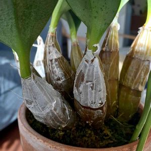 デンドロビウム アグレガタム リンドレイ花芽と思ってたら、新芽🌱😱高芽ですよね🌱 バルブもシワ寄って来てる😰 水遣りで失敗するので、久栄ナーセリーさんがプラ鉢で植えてみる事アドバイス頂き、枯れずに2年、でも花芽は一度も😰何が悪いのかわかりません、やっぱり素焼きに植え替えた方が良いですか?わかる方教えて下さい🙇♀️