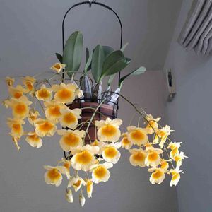 6月27日撮影。 開花が始まった直後です。今日は花びらが透けてきて皺もより始めてたので切りました。開花期は10日くらいということですね。 さて、この株、うちに来て4~5年目で初めての開花なのですが·····。 5月中は開花することもあるということで、適宜灌水しつつ、窓辺で管理してたのですが、6月になっても花芽が出なかったので、今年もダメかと屋外腰水管理に移行しました。 6月も半ばになった頃、なんか木の枝みたいなのが乗っかってるなと思って見てみると花芽でした。でも、その時すでに新芽も4本ほど伸びていまして、このまま雨ざらしにすると花芽がしけるかな?でも、今さら室内管理にするのもやだな、などと思いつつ、そのまま放置していたところ、雨ニモ負ケズ、風ニモ負ケズ、月末には開花に至りました。 梅雨入りする頃になって、新芽も伸びているのに花芽がついて開花するとか、そんな咲き方をすることはあるんでしょうか? それと、これはリンドレイ(Dendrobium lindleyi)でしょうか?ウェンフェン(Dendrobium Ueang Phueng)でしょうか? ちなみに名札はDen. lindleyiでした。 うちにはこの他に リンドレイ二株(一つはDen. aggregatum名、10年以上未開花。一つはDen. aggregatum majus名、昨年入手、今年3月に3本花芽が上がるも開花前に全滅)と、 ウェンフェン一株(Den. Ueng Tsueng(デンドロビウム ウェンツェン)名、昨春入手、昨年も今年も開花済み)があるのですが、バルブと葉だけだと、正直、どこで区別すればいいのかよくわかりません。 今回の株も20輪くらい咲けばリンドレイかな、とか、5輪くらいだったらウェンフェンなのかな、と割り切ることも出来たのですが、10輪というなんとも半端な花数。花の形や大きさはウェンフェンと遜色ありません。 そもそもウェンフェン(Ueang phueng)というのはリンドレイのことを意味するタイ語で、何でそんなもんを交配種の品種名に使っちゃったのか、誤認が起きてないのか?という疑問も有りますし、ウェンツェンだのアグレガタム マジャスだのといった実在しない種名や品種名の名札を付けて売ってる花屋が、ホントに自分が売ってるものの正体を分かって名札を付けてるのかという疑問もあります。 誰か具体的にどこで区別できるかご存じの方います?