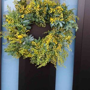 ミモザのリース スマートタイプ(笑) 3年越しでようやく花をつけた我が家のミモザ 枝を4本繋げて細身のリース完成♫ 玄関が春になりました🐝🌱