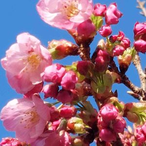 朝散歩 サクラ類としか名札ない 毎年早めに咲きます 濃い赤の可愛い桜、😍💓💓
