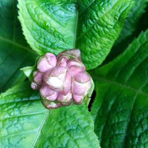 ギンバイソウの蕾です アジサイ科、、、葉っぱは間違いなくアジサイ。 梅に似た花を見られるのはもう少ししてから。 花はアジサイとはちょっと違う咲き方です。 「また、花を見たい」「また、行かないと!」と、思わせるニクイ演出です(≧∇≦)