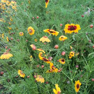 「河川敷で見つけた」 撮影📱2024.6.30 熊本市十禅寺町の 白川左岸河川敷で撮影📱 ハルシャギク🌼 河川敷の緑地部分で 群生して咲いてたよ😀 右側のpicは蕾 真ん丸の蕾が可愛い🤗