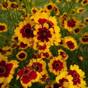 ハルシャギク(春車菊) ハルシャギク Coreopsis tinctoria キク科の一年草で,ジャノメソウまたはクジャクソウともいう。北アメリカ原産で,園芸品種が多数あり観賞用としてよく栽培され,属名のコレオプシスと呼ばれることも多い。現在では日本でも各地の空地などに野生化している。全体はコスモスによく似ていて,裂片の細い羽状複葉が対生し,初夏から秋まで,花茎の先端に次々と頭状花をつける。舌状花は幅が広く先端は浅く裂けていて黄色,基部は濃い赤褐色であるため,頭花全体が蛇の目の紋になる。