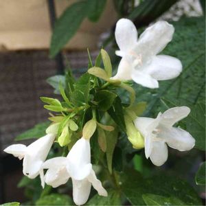 今朝、白いお花が咲いていてびっくりしたのですが、かなり前に寄せ植え用に枝っぽいグリーンをと購入したので、全く覚えておらず、以来、お花を見たのも初めて。葉が写ってないですが、班入りの葉で枝です。わかる方いらっしゃいましたら教えてください。