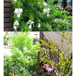 デュランタホワイト観察日記 デュランタホワイトの4月初旬の写真が出て来まし。枝に小さな葉っぱがいっぱい❤️ どうした物かと…。 そしたら葉っぱがどんどん大きくなって。 上の写真が外側からの写真です。 手前側はかなり刈り込んでます。 花が咲くかどうかは⁇です❣️