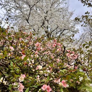 桜の木の下に可憐に咲いていた木瓜の花がとても可愛いくて見とれてしまいました。