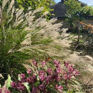 ダンチク 隣には、まだ背の低い斑入りダンチクが生えてましたが、こっちはとんでもなく大きい…😳 アシのおばけ👻まるで竹ぼうきみたい🙄