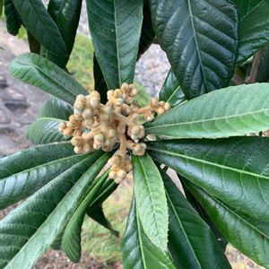 ビワのツボミ 周囲の木々は紅葉🍁真っ盛り… ビワはといえば、常緑樹、10月頃から、ツボミをつけるのですね… 晩秋から冬(11月から2月)にかけて開花するのになんて目立たない花なんでしょう😅 初夏に実るとたまらなくワクワクするのに…もっとしっかり花を愛でてあげようっと💕 葉は互生する単葉で、長楕円形~倒披針形です。 葉の表面には光沢があり、羽状脈が著しく目立ちます。 葉の裏面には淡い褐色の軟毛が密生します。 花は枝先の円錐花序に多数つき、白色の5弁花です。 果実は偽果で丸~洋ナシ形の黄橙色、果皮にはうっすらと毛がはえます。
