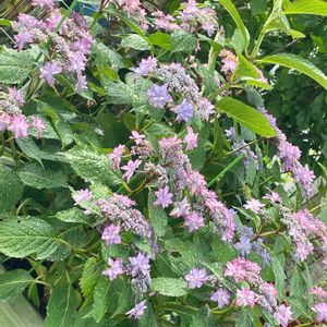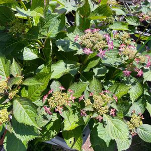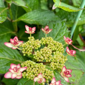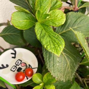 令和4年8月18(木)雨☔️ ガクアジサイ ひな祭り 花が終わって新芽🌱の上で✂️カット後です。今朝収穫の種蒔きミニトマト🍅🍅もいっしょに📸