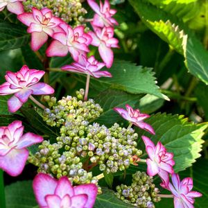 2022ー6ー5(日) 赤い縁取りグラデーションの魅力的なガクアジサイ ひな祭り🥰ガクがムラサキ?青っぽく見えますが🧐酸性雨?赤花用ね肥料を足しましょうかね~