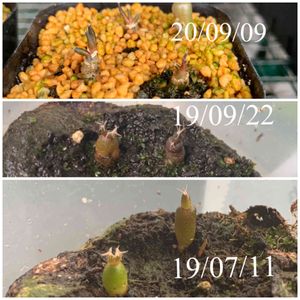 黒牡丹もアルストニーと同じ日 19/04/20播種 9個中6個発芽したけど 残ったのは3つ 真ん中の写真のまま動きがないし、冬には少し縮んでて、大丈夫!?死んでる!?と思いながら、アルストニーと共にベランダの簡易温室で冬越し(放置)。 春になっても黒牡丹はなんも変わらんし、あかんのかなって思ってたら、夏になってやっと動き出しました〜☺️ ちょっと上の部分伸びたし、増えてる! 正解かはわからんけど、成長してて嬉しい😊