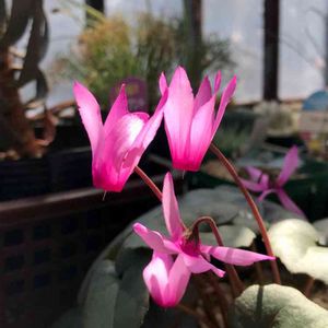 原種シクラメンのロディウムに日の光が当たり、ランタンのように優しく輝いておりました(*^^*) 花弁が薄っぺらく、透明感があって独特の雰囲気です✨