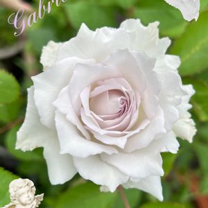 大好きな四季咲き大輪バラ 天使ガブリエル様が咲き🥀 3回目の二番花です、今朝はアプリで可愛く飾りました ほんのり薄紫になる花びらは,白くて清純なバラですね
