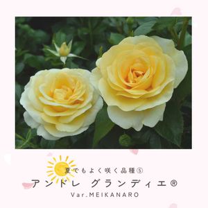 夏でもよく咲く品種⑤ - アンドレ グランディエ® - ベルサイユのばらの主人公オスカルを 献身的に支えたアンドレ。 やわらかな色彩と、 ふっくらとおおらかに開花する様子は、 アンドレの強く深い愛を秘めた心を思わせます。 花付きが良く黒星病に強い品種で、 樹勢も良く育てやすいバラです。 夏の暑さにも耐えて元気に咲きます。