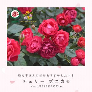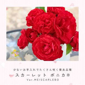 初心者さんにぜひおすすめしたい! - チェリー ボニカ® - 『チェリー ボニカ®』は とても育てやすい品種で 初心者の方からあまりお世話する時間がない方でも、 きれいに花を咲かせることができます✨ 花付きもとても良く、 丸いお花も可愛いです❤ 病気にも強くて株の勢いもあるので、 花がたくさん咲いていても 次から次へとつぼみが付きます。 花がらを摘んで株の体力を残しても良いですが そのままでも花が咲き続けるくらい、 元気いっぱいの品種です。 冬の剪定も、あまり何も考えずに 高さを揃えて整えるようにするだけで十分です。 春には整った樹形で花がたくさん咲いてくれますよ😆 お手入れが簡単な品種なので その分楽しめる場所も広がります✨ バラ栽培は難しそうと感じている方にも 是非育てていただきたいです! . ・*:..。o○゚・*:..。o○゚・*:..。o○゚ 【チェリー ボニカ®】 系統:四季咲き中輪系 花色:レッド~ローズレッド 花径:7cm 樹高:0.7~1.2m カップ咲き/横張り性 ・*:..。o○゚・*:..。o○゚・*:..。o○゚