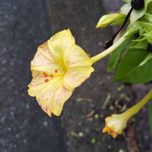 オシロイバナ愛好家友の会🏷 幸せの黄色いお花🏷 熱海の皆さんにエールを🏷 ウキウキわくわく♪🏷 黄色花に赤が少し入った優しい色… もう種が、、、😲