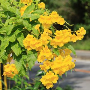 昨日、ドライブ中に会った花 🟡キンレイジュ🟡 ラッパ状の花が房状に咲く 鮮やかな黄色が目に止まりました。 ノウゼンカズラ科 テコマ属 メキシコ、中米原産 別名:キバナテコマ、タチノウゼン イエローベル
