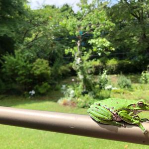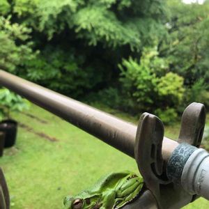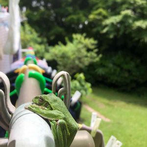 モリアオガエル🐸 お花でないのですが、、🙇♂️ 今日は雨☔️ 嬉しそうに物干し竿の上でくつろいでいました☺️