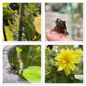 🐸番外編🐸 (苦手な方はごめんなさい🙇♂️) 庭の蓮鉢で生まれたおたまこ達 ようやく脚が生えてきました。 左上はキュウリの支柱にしがみつく親蛙 アワアワたまごは5/5に投稿しています。