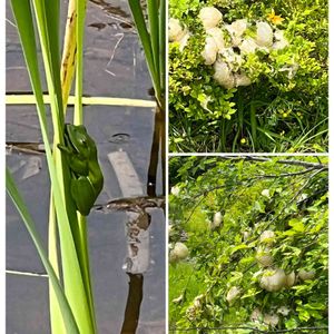 モリアオガエルの卵🥚 🐸ネタばかりで失礼します🙇♂️ 今朝、ハス鉢の上に干してある軍手に産卵されていました。 (軍手がお見苦しくてすみません💦) この卵塊の中に300ー400個の卵が入っており、1週間ほどで雨に打たれて卵が破けてたくさんのおたまじゃくしが飛び出してきます。