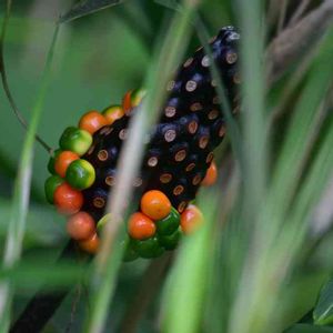 2021年6月30日(水) 藪が茂って見過ごしていたけど、マムシグサ(蝮草)の実が緑色からオレンジ色の熟し、地面に落ちて下地の黒色が見え始めていた。