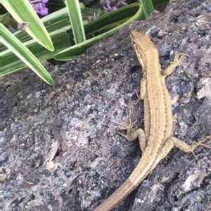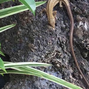 擬態、自信があるのかカナヘビ動きません。 日向ぼっこかも? 尻尾の色が変わっているのは、切れた後再生した証だそうです。 家の庭は野良ちゃん😸達の通り道になっているので、切られたのかもしれません。