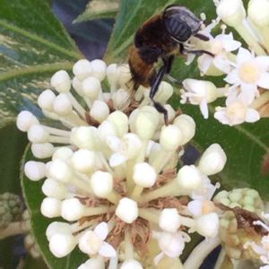 金曜日の蕾たち その後 ⑤-2 ヤツデ開花し始めました。 お腹に一本の縞がある蜂🐝?あぶ🪰? 最近毎日来ています。